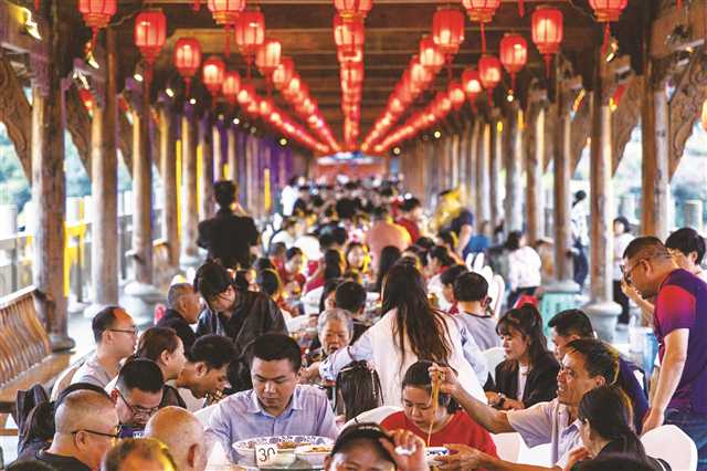 9月29日,荣昌区夏布小镇联昇廊桥,游客们在团圆宴上迎接中秋。