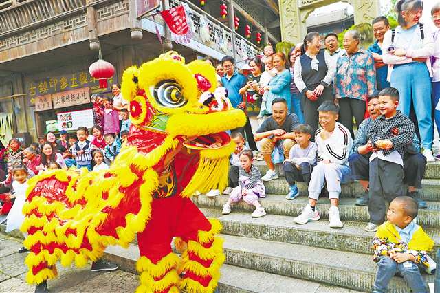 6月9日,黔江区濯水古镇,民间艺人正在表演非遗项目舞狮。特约摄影 杨敏/视觉重庆